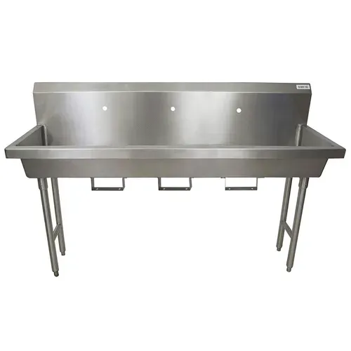 Three Station Handwash Sink, freestanding, (3) single hole splash mount faucet holes, 72"W x 19-7/8" front-to-back x 8" deep bowl, knee valve bracket, 14/304 stainless steel sink, basket drain, 18 gauge stainless steel legs & supports, NSF (3-5 day lead time)Q & A