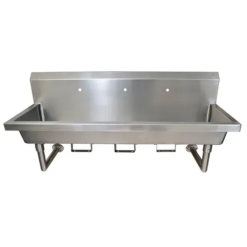 Three Station Handwash Sink, wall mounted, (3) single hole splash mount faucet holes, 72"W x 19-7/8" front-to-back x 8" deep bowl, knee valve bracket, 14/304 stainless steel sink, basket drain, 18 gauge stainless steel legs & supports, NSF (3-5 day lead time)Q & A