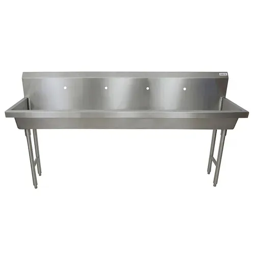 Four Station Handwash Sink, freestanding, (4) single hole splash mount faucet holes, 96"W x 19-7/8" front-to-back x 8" deep bowl, 14/304 stainless steel sink, basket drain, 18 gauge stainless steel legs & supports, NSF (3-5 day lead time)Q & A