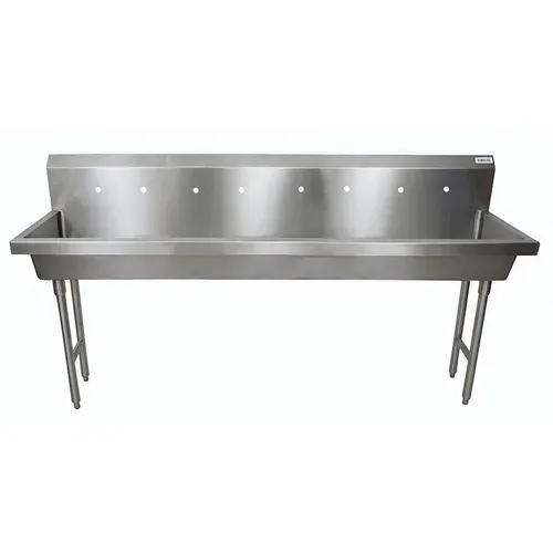 Four Station Handwash Sink, freestanding, (4) sets of 8" OC splash mount faucet holes, 96"W x 19-7/8" front-to-back x 8" deep bowl, 14/304 stainless steel sink, basket drain, 18 gauge stainless steel legs & supports, NSF (3-5 day lead time)Q & A