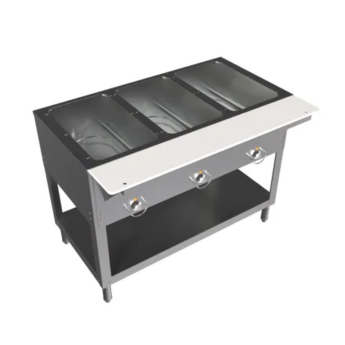Steam Table, electric, 3-pan open well design, 20-gauge stainless steel construction, open base with shelf, die-stamped openings, infinite temperature control, independently controlled wells with indicator lights, removable poly cutting board with stainless steel support shelf, galvanized liner, undershelf for storage, sneeze guards, overshelves, and extra parts available at an additional cost, 500W per well, NSF, cULusQ & A