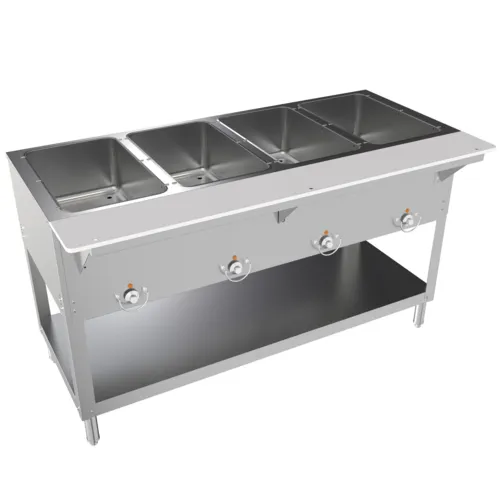 Steam Table, electric, 4-pan sealed well design, 20-gauge stainless steel construction, partially enclosed base with shelf, die-stamped openings, infinite temperature control, accommodates 4 full-size food pans for wet heating only, removable poly cutting board with stainless steel support shelf, sealed compartments, sneeze guards, overshelves, and extra parts available at an additional cost, 750W per well, NSF, cULusQ & A