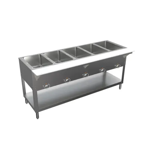 Steam Table, electric, 5-pan sealed well design, 20-gauge stainless steel construction, die-stamped openings, open base with undershelf for storage, infinite temperature control, independently controlled wells with indicator lights, removable poly cutting board with stainless steel support shelf, sealed compartments, casters, sneeze guards, overshelves, and extra parts available at an additional cost, 750W per well, NSF, cULusQ & A