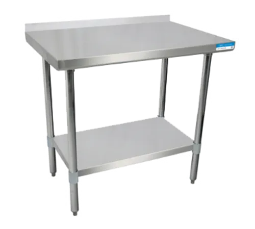 Work Table, 36"W x 18"D, 18/430 stainless steel top, with turndown edges on front & sides, reinforced with channels, 1-1/2" rear riser, adjustable stainless steel undershelf, 1-5/8" dia., stainless steel legs, stainless steel over plastic adjustable bullet feet, NSFQ & A