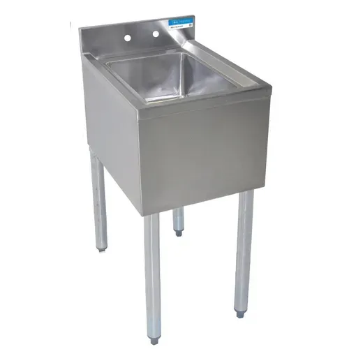 Underbar Dump Sink, 12"W x 18"D x 32-1/2"H overall size, 10" wide x 14" front-to-back x 6" deep bowl, 4" OC splash mount faucet holes, 18/304 stainless steel top, stainless steel legs & bracing, adjustable high impact corrosion resistant feet, NSFQ & A