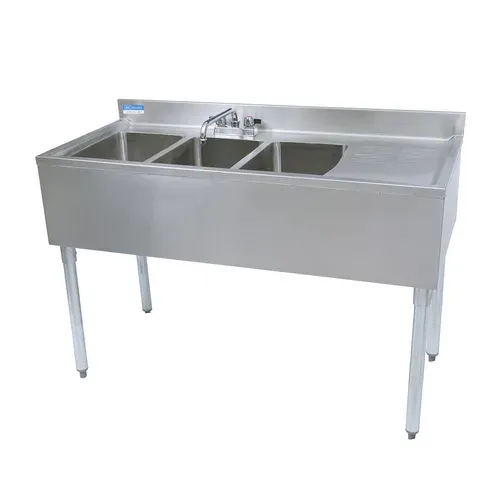 Slim-Line Underbar Sink, three compartment, 48”W x 18-1/4"D x 32-1/2"H overall size, 10" wide x 14" front-to-back x 10" deep compartments, 13-5/8” stamped drainboard on right, 4-1/2"H backsplash, 4" OC splash mount lead-free faucet (BKF-W2-10-G), stainless steel apron on front & sides, includes basket drains (BKDR-2) & removable overflow standpipes (BK-OT-15075), 18/304 stainless steel construction, stainless steel legs & adjustable side bracing, adjustable high impact corrosion resistant feet, NSFQ & A