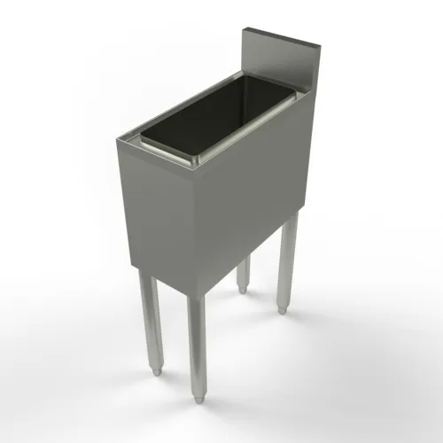 Underbar Ice Bin, for bottle storage, 8"W x 18"D, 22 lbs capacity, 12-9/16" deep bin, 4"H backsplash, 1" NPS drain with plug, 18/304 stainless steel construction, stainless steel legs & adjustable side bracing, adjustable corrosion resistant feet, NSFQ & A