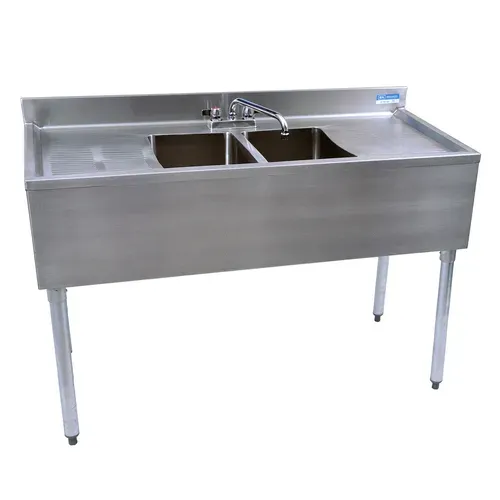 Underbar Sink, two compartment, 48”W x 21-1/4"D x 32-1/2"H overall size, 10" wide x 14" front-to-back x 10" deep compartments, (2) left & right 13-3/16" stamped drainboards, 4-1/2"H backsplash, 4" OC deck mount lead-free faucet (BKD-10-G), stainless steel apron on front & sides, includes basket drains (BKDR-2) & removable overflow standpipes (BK-OT-15075), 18/304 stainless steel construction, stainless steel legs & adjustable side bracing, adjustable high impact corrosion resistant feet, NSFQ & A