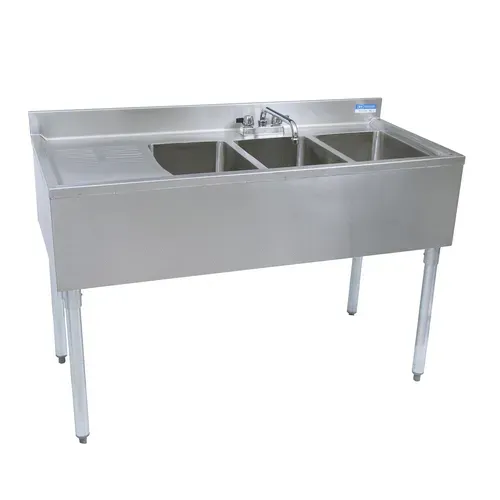 Underbar Sink, three compartment, 48”W x 21-1/4"D x 32-1/2"H overall size, 10" wide x 14" front-to-back x 10" deep compartments, 13-5/8” stamped drainboard on left, 4-1/2"H backsplash, 4" OC deck mount lead-free faucet (BKD-10-G), stainless steel apron on front & sides, includes basket drains (BKDR-2) & removable overflow standpipes (BK-OT-15075), 18/304 stainless steel construction, stainless steel legs & adjustable side bracing, adjustable high impact corrosion resistant feet, NSFQ & A