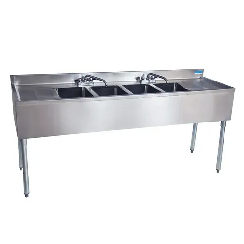 Underbar Sink, four compartment, 84”W x 21-1/4"D x 32-1/2"H overall size, 10" wide x 14" front-to-back x 10" deep compartments, (2) left & right 19" stamped drainboards, 4-1/2"H backsplash, (2) 4" OC deck mount lead-free faucets (BKD-10-G), stainless steel apron on front & sides, includes basket drains (BKDR-2) & removable overflow standpipes (BK-OT-15075), 18/304 stainless steel construction, stainless steel legs & adjustable side bracing, adjustable high impact corrosion resistant feet, NSFQ & A