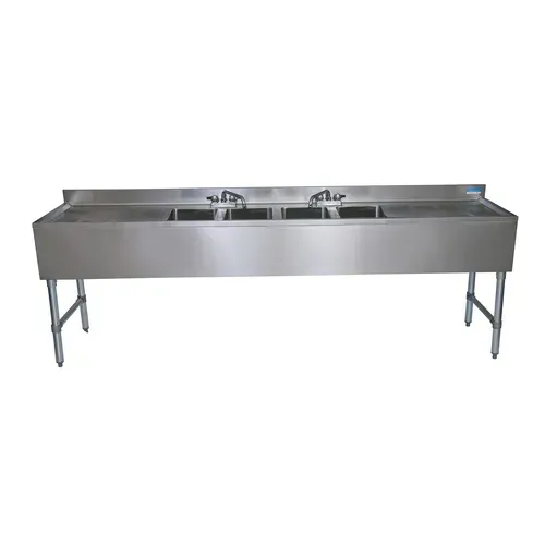 Underbar Sink, four compartment, 96”W x 21-1/4"D x 32-1/2"H overall size, 10" wide x 14" front-to-back x 10" deep compartments, (2) left & right 25" stamped drainboards, 4-1/2"H backsplash, (2) 4" OC deck mount lead-free faucets (BKD-10-G), stainless steel apron on front & sides, includes basket drains (BKDR-2) & removable overflow standpipes (BK-OT-15075), 18/304 stainless steel construction, stainless steel legs & adjustable side bracing, adjustable high impact corrosion resistant feet, NSFQ & A