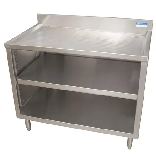 Underbar Glass Rack Unit, drainboard top, 48"W x 21"D x 32-1/2"H, open front base, adjustable shelf, 18/304 stainless steel top with 3" backsplash, & 1" NPS drain (BKDR-15CP), stainless steel legs, adjustable high impact corrosion resistant feet, NSFQ & A