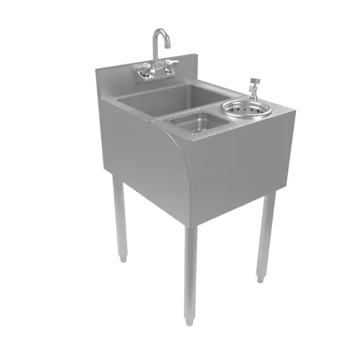 Speed Station With Dump Sink, 18"W x 21-1/4"D, 14" wide x 10" front-to-back x 6" deep sink bowl with 1-1/2" drain, 4" O.C. splash mount faucet holes, stainless steel legs, adjustable plastic bullet feet, 18 gauge stainless steel constructionQ & A