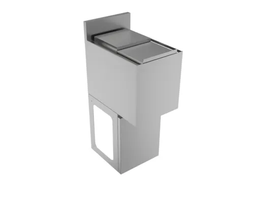 Underbar Ice Bin, 12"L x 21"W x 34"H, 33 lbs capacity, 12-9/16" deep bin, 4"H backsplash, 1-1/2" NPS drain with plug, includes sliding bin cover (BKIB-L-1221), 18 guage /T-304 stainless steel construction, pedestal baseQ & A
