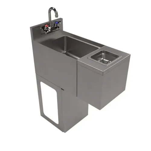 Glass Rinser Hand Sink, 12"W x 26-1/4"D x 34"H O.A., 28-1/2"H working height, bowl dimensions: 10"W x 14"D x 6" deep bowl, splash mount lead-free faucet (BKF-W2-6-G), Push Down Glass Rinser (12"W x 8"D O.A.), 18/304 stainless steel construction, removable 18 gauge stainless steel front panels with galvenized base, NSFQ & A