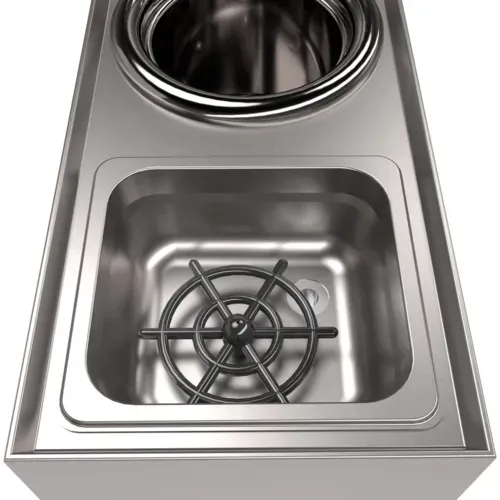 Underbar Speed Station, 8"W x 18-1/4"D x 34"H, 4' riser, dipper well faucet, dipper well bowl with basket drain (BK-DWBA), push down glass rinser, 18/340 stainless steel construction, pedestal baseQ & A
