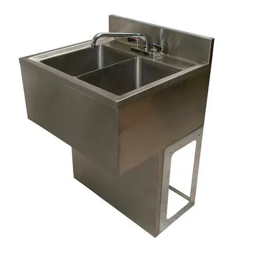 Underbar Sink, three compartment, 60”W x 21-1/4"D x 34"H overall size, 10" wide x 14" front-to-back x 10" deep compartments, (2) left & right 13-1/2" stamped drainboards, 4-1/2"H backsplash, 4" OC deck mount lead-free faucet (BKD-10-G), stainless steel apron on front & sides, includes basket drains (BKDR-2) & removable overflow standpipes (BK-OT-15075), 18/304 stainless steel construction, removable stainless steel front panel on galvanized pedestal base, NSFQ & A