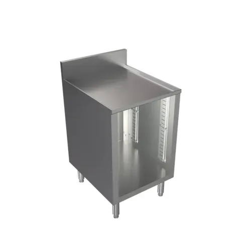 Well Series Underbar Cabinet, 24"x21", flat top with raised edge, with legs, 18-gauge stainless steel construction, 6" adjustable legs, accepts optional adjustable shelf, riser, 18"x21".Q & A