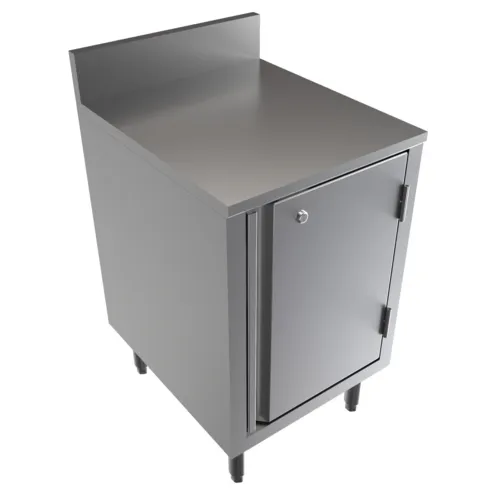 Well Series Underbar Cabinet, flat top, 18"x21", 18-gauge stainless steel construction, 6" adjustable legs, accepts optional adjustable shelf, riser, hinged door with lock, (3-10 Day Lead Time).Q & A