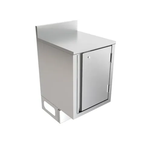 Call Series Underbar Cabinet, flat top, pedestal base, 18"x21", 18-gauge stainless steel construction, accepts optional adjustable shelf, riser, hinged door with lock, (3-10 Day Lead Time).Q & A