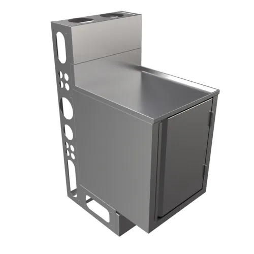 Top Shelf Underbar Cabinet, flat top with raised edge, 18"x21", die wall, 18-gauge stainless steel construction, accepts optional adjustable shelf, riser, hinged door, (3-10 Day Lead Time).Q & A