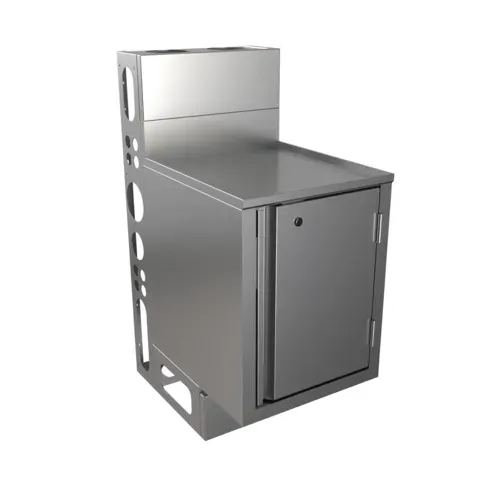 Top Shelf Underbar Cabinet, flat top with raised edge, 18"x21", die wall, 18-gauge stainless steel construction, accepts optional adjustable shelf, riser, hinged door with lock, (3-10 Day Lead Time).Q & A