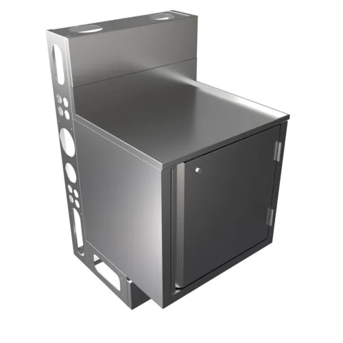 Top Shelf Underbar Cabinet, flat top with raised edge, 24"x21", die wall, 18-gauge stainless steel construction, accepts optional adjustable shelf, riser, hinged door with lock, (3-10 Day Lead Time)Q & A