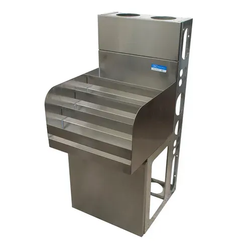 Underbar Liquor Bottle Display Unit, 18"W X 18-1/4"D x 33-1/2"H, (4) steps with guard rail, approximately (20) bottle capacity, 18/304 stainless steel construction, 1-5/8" diameter die wall and base, adjustable plastic bullet feet, NSFQ & A