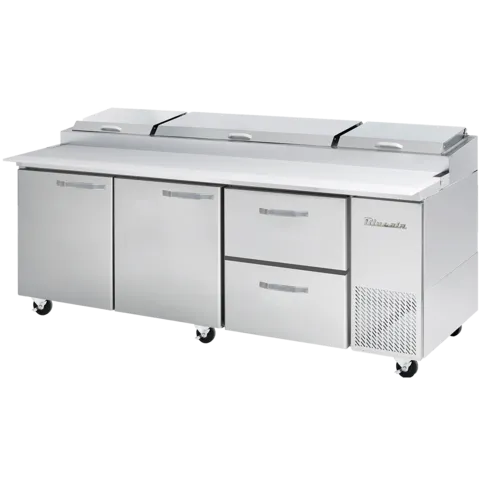 Pizza Prep Table, three-section, 93-1/4"W, 30.8 cu. ft. capacity, side-mounted self-contained refrigeration, (2) drawers (on right), (2) door (on left), (2) adjustable wire shelves, accommodates (12) 1/3 size pans, insulated pan cover with stainless steel divider, 33°-39°F temperature range, 19"D cutting board, stainless steel interior & exterior, 4"H swivel casters (2 braked), R290 Hydrocarbon refrigerant, 3/8 HP, 115v/60/1-ph, 3.5 amps, cord, NEMA 5-15P, cUL, UL, ETL-SanitationQ & A