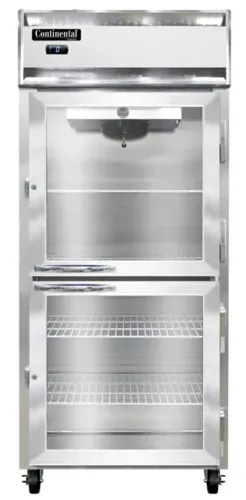 Extra-Extra-Wide Freezer, display, 36-1/4" wide one-section, self-contained refrigeration, aluminum exterior & interior, stainless steel front, standard depth, wide hinged glass half doors, electronic controller w/ digital display, electric condensate evaporator, 5" castersQ & A