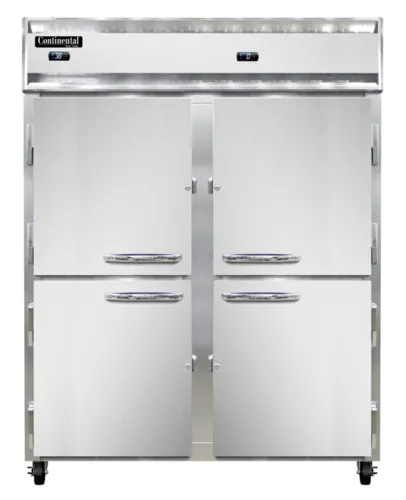 Extra-Wide Refrigerator/Freezer, reach-in, 57" wide two-section, self-contained refrigeration, stainless steel front, aluminum interior & ends, standard depth, half-height solid doors, electronic controller w/ digital display, electric condensate evaporator, 5" castersQ & A