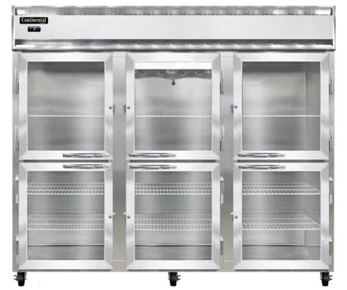 Extra-Wide Freezer, reach-in, 85-1/2" three-section, self-contained refrigeration, aluminum exterior & interior, stainless steel front, standard depth, wide half-height glass doors, electronic controller w/ digital display, electric condensate evaporator, 5" castersQ & A