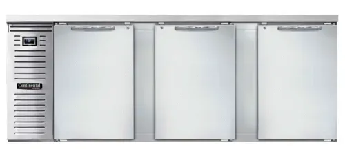 Refrigerated Back Bar Cooler, 90"W, 34-3/4"H, 35.0 cu. ft., front breathing, stainless steel top, (3) doors with locks, electronic controller with digital display & hi-low alarm, stainless steel exterior, stainless steel interior back & side panels with reinforced stainless steel floor, epoxy coated steel shelves, self-contained refrigeration, R290 Hydrocarbon refrigerant, 1/4 HP, cETLus, NSFQ & A