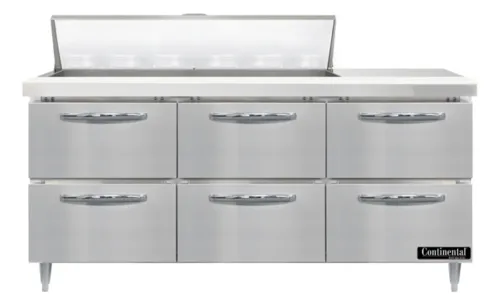 Designer Line Sandwich Unit, 72" wide, three-section, (12) 1/6 size x 4" deep pans with 12" cutting board, (6) drawers, stainless steel top, front, sides & interior, 6" adjustable legs, electronic controller w/ digital display, rear mounted self-contained refrigerationQ & A