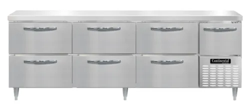 Designer Line Refrigerated Base, 93" wide, reinforced stainless steel work top, stainless steel exterior, front, sides & interior, (6) drawers & (1) half height field rehingeable doors, 6" adjustable stainless steel legs, , side-mounted refrigeration, NSF, CE, ETLQ & A