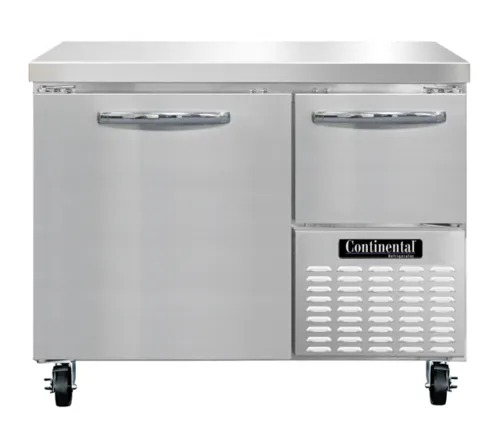 Freezer Base, 43" wide, #300 Series stainless steel flat work top, stainless steel front and end panels, galvanized steel rear and grill, aluminum interior, (1) full & (1) half height field rehingeable doors, electronic controller w/ digital display, 5" casters, , side-mounted refrigerationQ & A