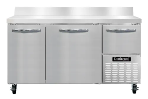 Freezer Base, 60" wide, #300 Series stainless steel work top with 5 1/2" backsplash, stainless steel front and end panels, galvanized steel rear and grill, aluminum interior, (2) full & (1) half height field rehingeable doors, electronic controller w/ digital display, 5" casters, , side-mounted refrigerationQ & A