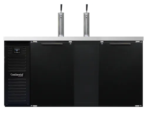 Draft Beer Cooler, 69" wide, 26.0 cubic feet, front breathing, (3) barrel or straight wall keg capacity, stainless steel top with (2) columns & drainer, (2) doors with locks, textured baked black enamel finish exterior, stainless steel interior back and side panels with reinforced stainless steel floor, self-contained refrigeration, electronic controller w/ digital displayQ & A