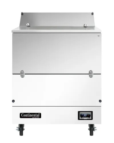 Milk Cooler, 34" long, dual access, forced air cooling, (8) 13" x 13" x 11" or (4) 19" x 13" x 11" crate capacity, stainless steel top, lids & doors, white finished steel exterior body, galvanized interior with reinforced stainless steel floor, electronic controller w/digital display, (4) locking swivel casters, ENERGY STAR®Q & A
