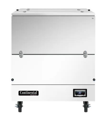 Milk Cooler, 34" long, dual access, cold wall cooling, (8) 13" x 13" x 11" or (4) 19" x 13" x 11" crate capacity, stainless steel top, lids & doors, white finished steel exterior body, galvanized interior with reinforced stainless steel floor, electronic controller w/digital display, (4) locking swivel casters, ENERGY STAR®Q & A
