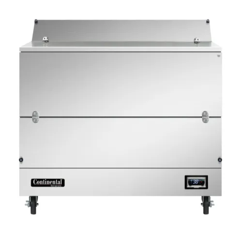 Milk Cooler, 49" long, single access, forced air cooling, (12) 13" x 13" x 11" or (8) 19" x 13" x 11" crate cap., stainless steel interior & exterior, electronic controller w/digital display, (4) locking swivel casters, ENERGY STAR®Q & A