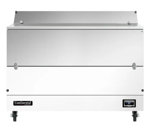 Milk Cooler, 58" long, single access, forced air cooling, (16) 13" x 13" x 11" or (10) 19" x 13" x 11" crate capacity, stainless steel top, lid & door, white finished steel exterior body, galvanized interior with reinforced stainless steel floor, electronic controller w/digital display, (4) locking swivel casters, ENERGY STAR®Q & A
