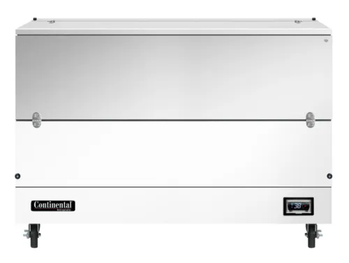 Milk Cooler, 58" long, single access, cold wall cooling, (16) 13" x 13" x 11" or (10) 19" x 13" x 11" crate capacity, stainless steel top, lid & door, white finished steel exterior body, galvanized interior with reinforced stainless steel floor, electronic controller w/digital display, (4) locking swivel casters, ENERGY STAR®Q & A