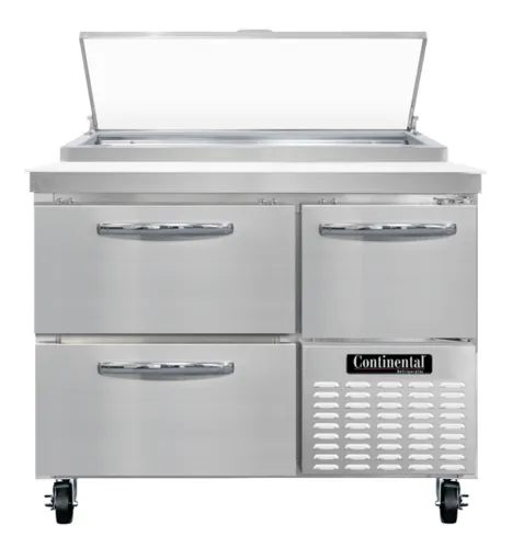 Pizza Prep Table, 43" wide, one-section, 12.0 cubic feet, forced air, #300 Series stainless steel work top with 19" poly cutting board, (2) drawers hold (2) 12 x 20 x 6 pans per drawer (supplied by others), stainless steel front and end panels, aluminum interior, electronic controller w/ digital display, 5" swivel casters, side-mounted refrigerationQ & A