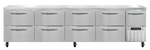 Refrigerated Base, 118" wide, #300 Series stainless steel flat work top, stainless steel front and end panels, galvanized steel rear and grill, aluminum interior, (8) drawers hold (2) 12 x 20 x 6 pans per drawer (supplied by others), (1) half height field rehingeable door, electronic controller w/ digital display, 5" casters, , side-mounted refrigerationQ & A
