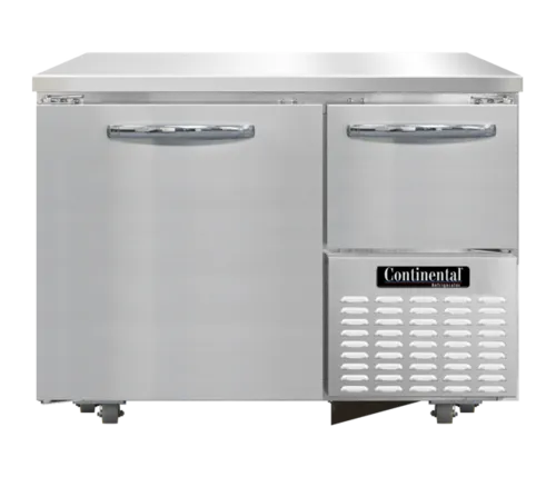 Undercounter Refrigerated Base, 43" wide, #300 Series stainless steel work top, stainless steel front and end panels, galvanized steel rear and grill, aluminum interior, (1) full & (1) half height field rehingeable doors, 1 3/8" diameter plate casters mounted on heavy-duty support plates (field installed), electronic controller w/ digital display, front breather air divider (field installed), side-mounted refrigeration, ENERGY STAR®Q & A