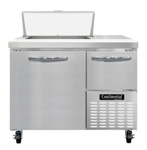 Refrigerated Base Sandwich Unit, 43" wide, #300 Series stainless steel top with (6) 1/6 size x 4" deep non-recessed pans, stainless steel front & sides, galvanized steel case back, aluminum interior, 12" deep nylon cutting board, (1) full & (1) half height field rehingeable doors, electronic controller w/ digital display, 5" casters, , side-mounted refrigerationQ & A