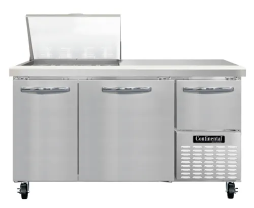 Refrigerated Base Sandwich Unit, 60" wide, #300 Series stainless steel (Mighty) top with (12) 1/6 size x 4" deep non-recessed pans, stainless steel front & sides, galvanized steel case back, aluminum interior, 10" deep nylon cutting board, (2) full & (1) half height field rehingeable doors, electronic controller w/ digital display, 5" casters, , side-mounted refrigerationQ & A