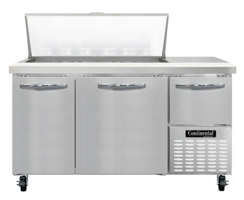 Refrigerated Base Sandwich Unit, 60" wide, #300 Series stainless steel (Mighty) top with (18) 1/6 size x 4" deep non-recessed pans, stainless steel front & sides, galvanized steel case back, aluminum interior, 10" deep nylon cutting board, (2) full & (1) half height field rehingeable doors, electronic controller w/ digital display, 5" casters, , side-mounted refrigerationQ & A
