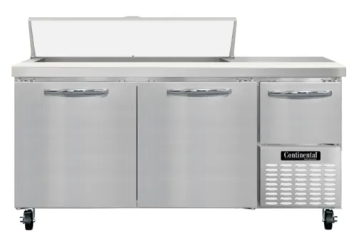 Refrigerated Base Sandwich Unit, 68" wide, #300 Series stainless steel top with (12) 1/6 size x 4" deep non-recessed pans, stainless steel front & sides, galvanized steel case back, aluminum interior, 12" deep nylon cutting board, (2) full & (1) half height field rehingeable doors, electronic controller w/ digital display, 5" casters, , side-mounted refrigerationQ & A